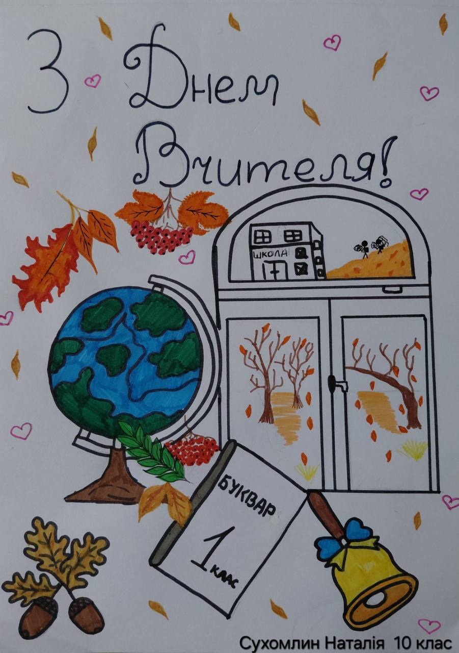 Щороку в першу неділю жовтня Україна відзначає День вчителя. Це свято гідних, сильних, мудрих та відважних людей. Вчитель — це не просто складна та важлива професія, це справжня місія. Бо саме вчителі роблять нашу країну сучасною, сильною та розвиненою, а українців — гідними, розумними, навченими, людяними. Дякуємо всім освітянам за чесну, важку працю, за цей неймовірний вклад. Хай всі ваші старання та зусилля роблять наш чудовий світ ще прекраснішим! Міцного вам здоров’я, величезного терпіння, радості та внутрішньої гармонії, поваги та щирої вдячності від учнів та батьків! Напередодні свята учні ліцею привітали вчителів зворушливими малюнками і віршами