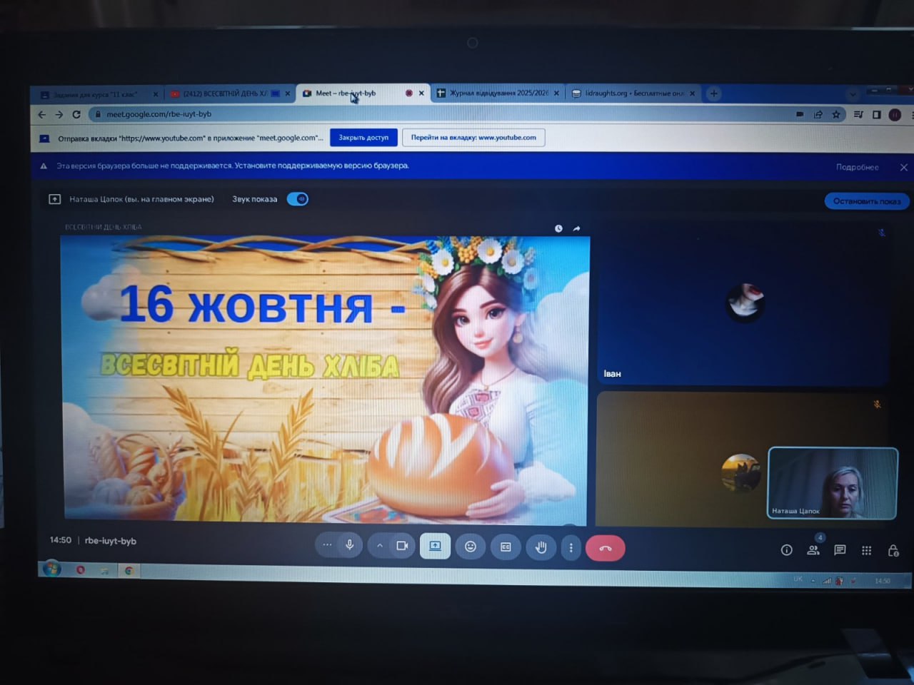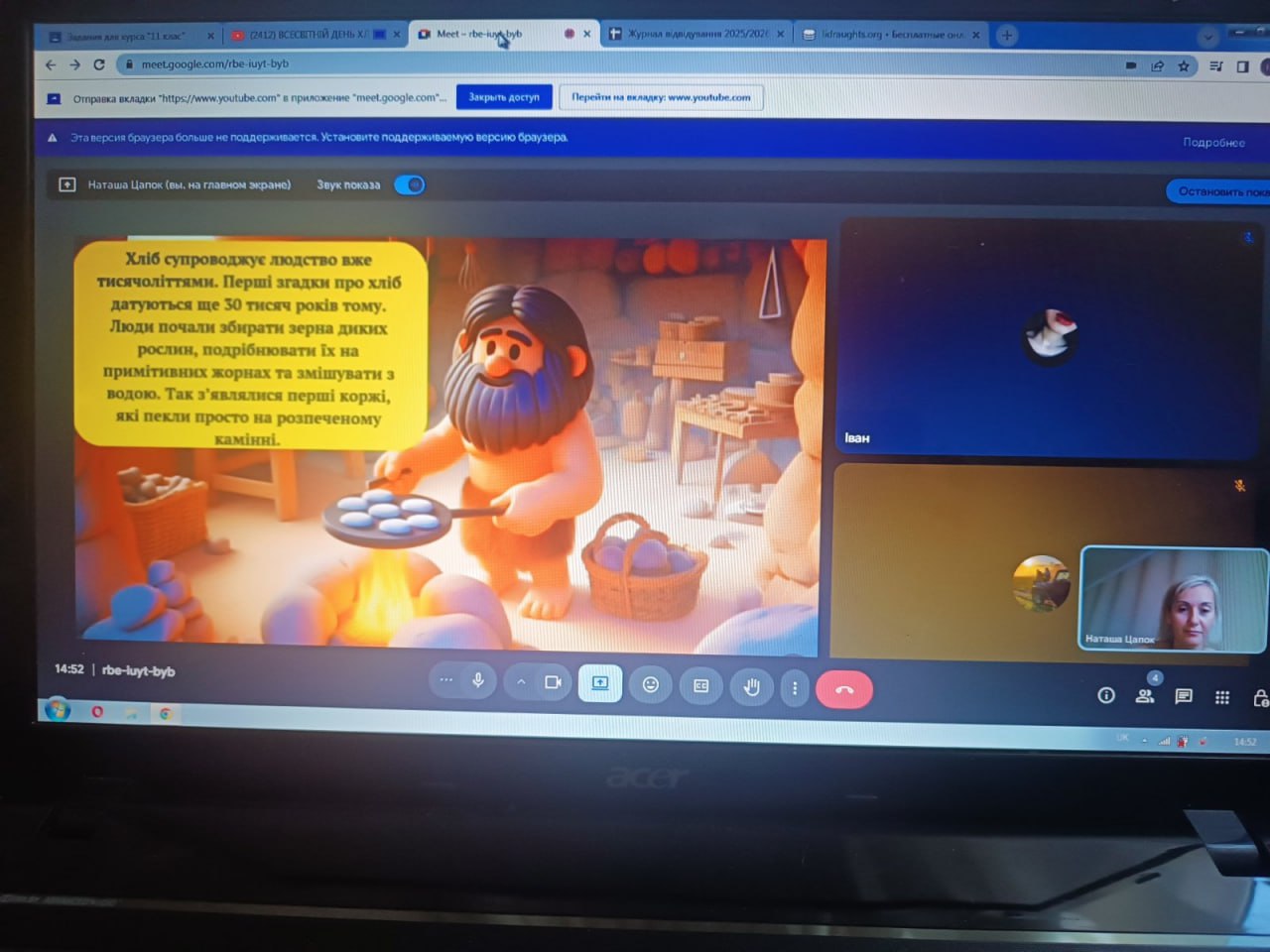 Хліб один із найпопулярніших продуктів у світі, без якого не обходиться жодний день нашого життя. Тому не дивно, що в нього є своє свято – Всесвітній день хліба, що відзначається щорічно 16 жовтня. Сьогодні, як і в усі часи, у будь-якій країні світу хліб та хлібобулочні вироби користуються незмінною любов’ю. Люди різних національностей завжди дбайливо ставилися до хліба. Хліб був і залишається символом життя. З метою вшанування значення хліба та праці людей, які його виготовляють, в ліцеї відбулися виховні бесіди, під час яких діти дізнавалися цікаві історії , вислови та традиції про хліб . Всесвітній день хліба – це й професійне свято працівників цієї галузі, і, звичайно ж, данина поваги до символу життя. Вітаємо всіх, хто любить хліб, хто шанує його, хто вкладає в його створення часточку себе!
