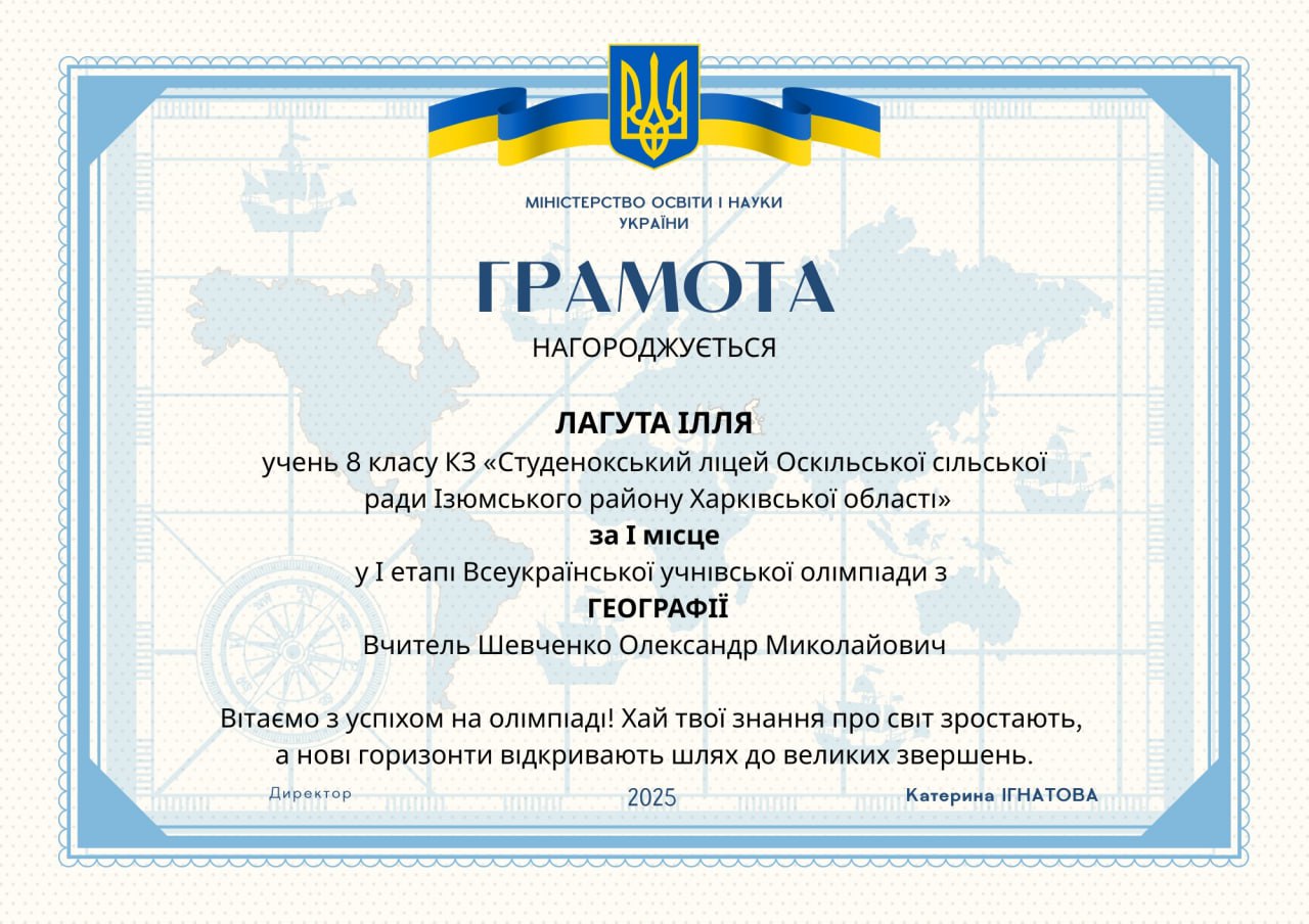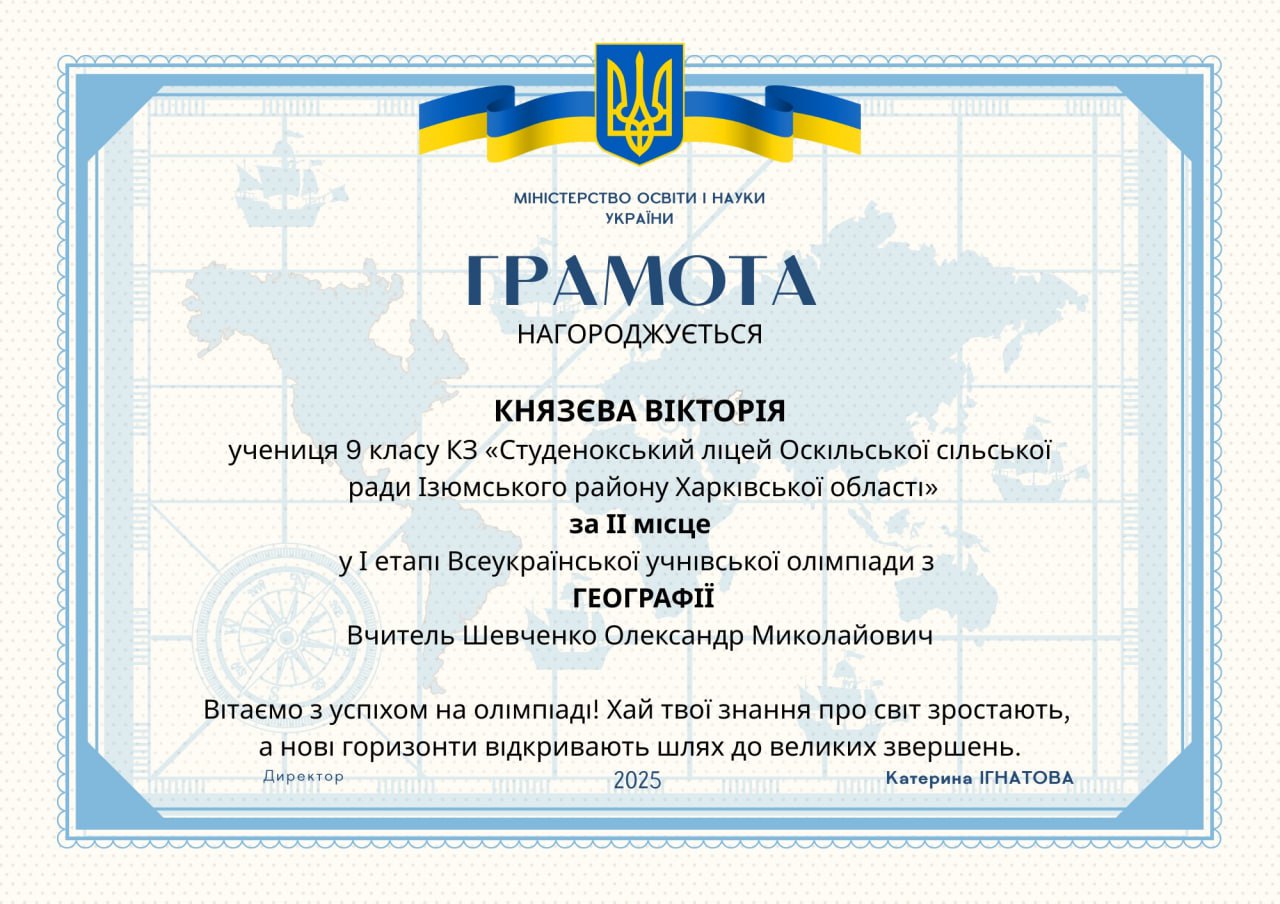 Вітаємо з успіхом на олімпіаді! Хай ваші знання про світ зростають, а нові горизонти відкривають шлях до великих звершень.