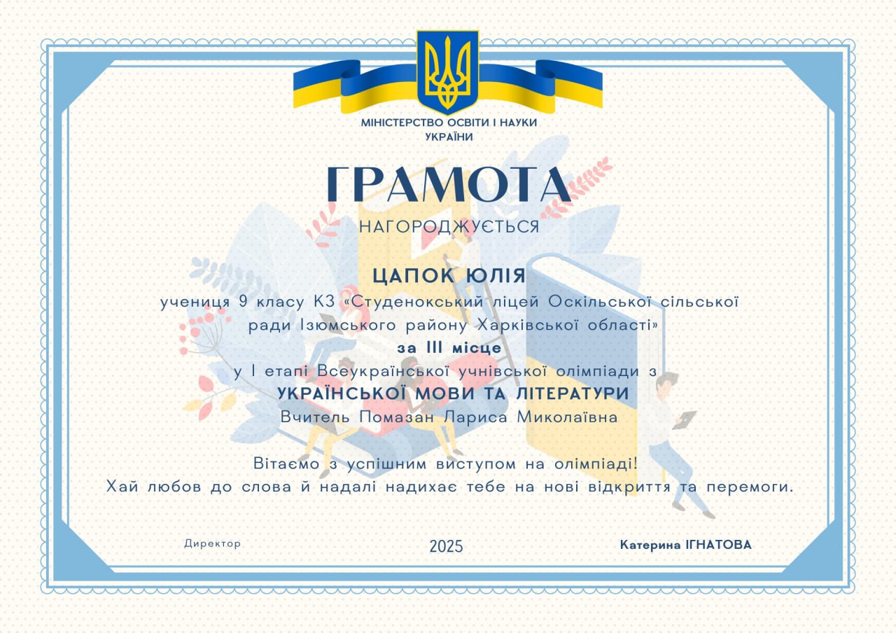 ІІІ місце – Цапок Юлія учениця 9 класу