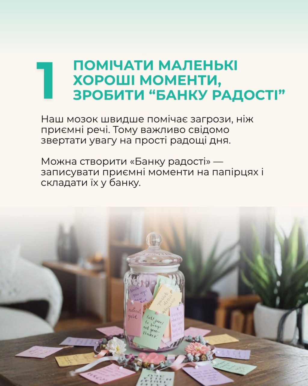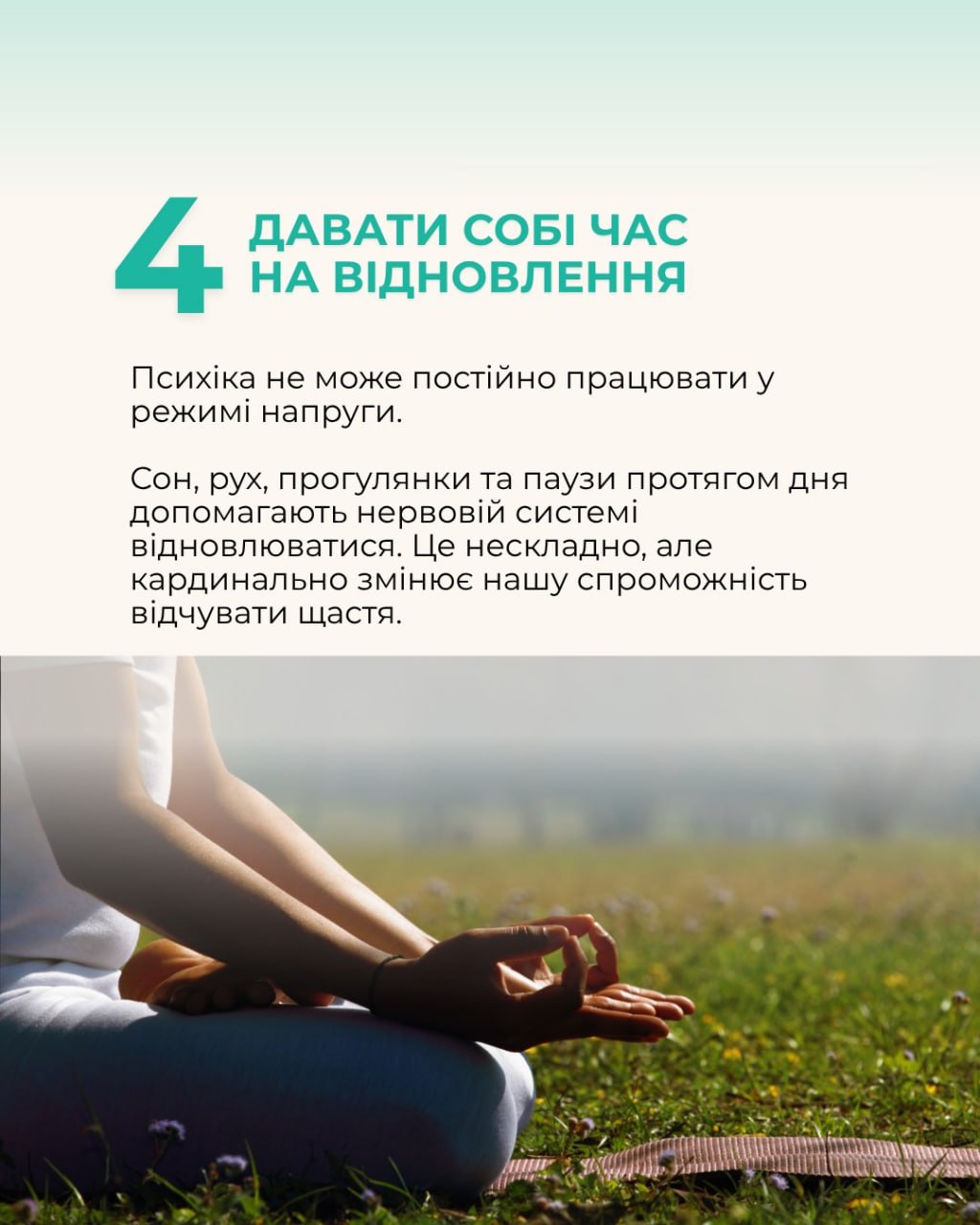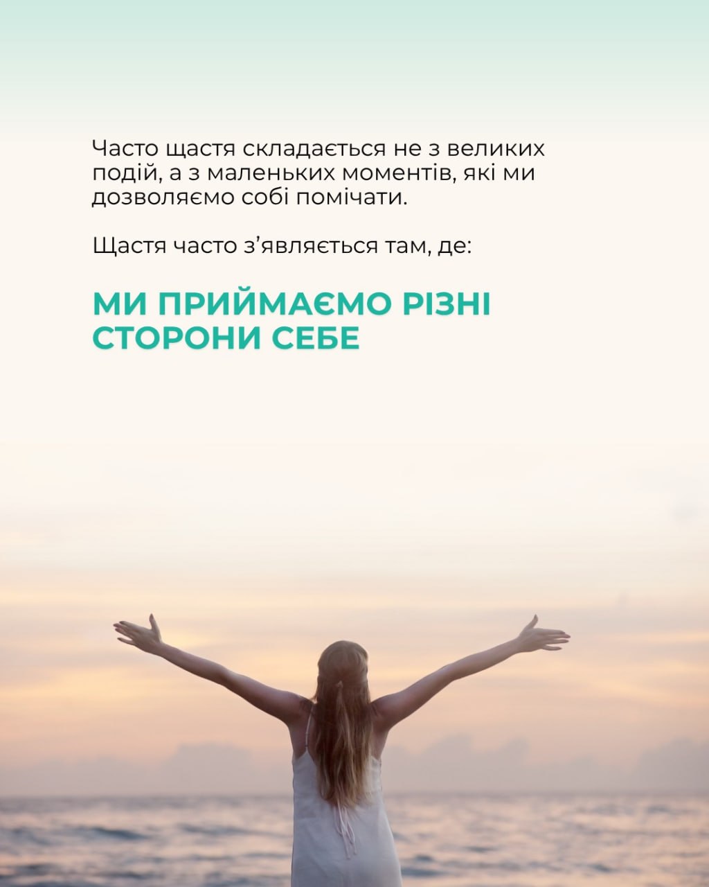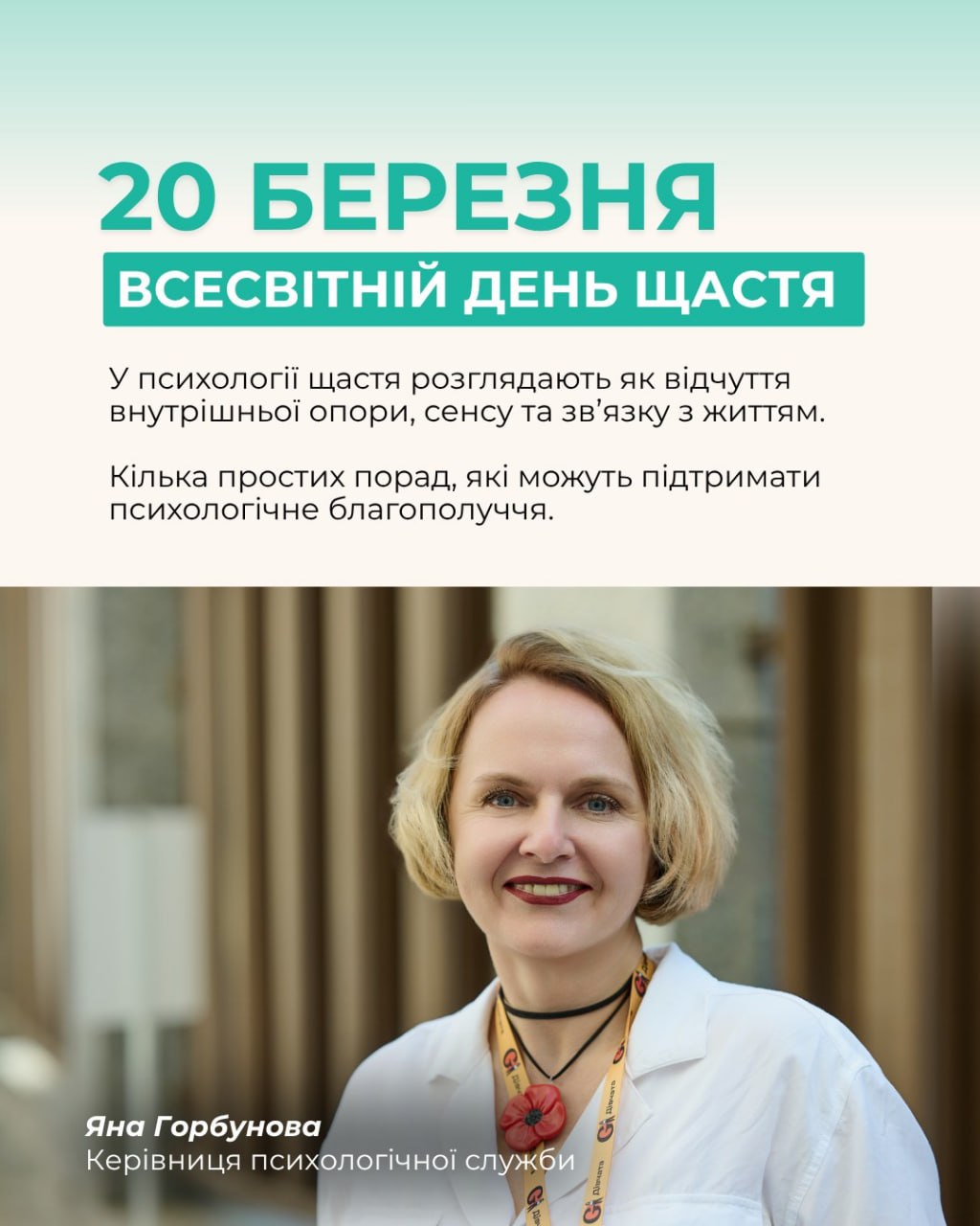 20 березня — Міжнародний день щастя. Сьогодні кожен українець особливо гостро розуміє справжню ціну цього слова. Щастя для нас — це не щось абстрактне. Це ранок без тривог. Це дзвінок від рідних. Це новини, які дають надію. Це обійми, які стали ще ціннішими. Ми навчилися знаходити світло навіть у найтемніші дні. Ми тримаємося, допомагаємо одне одному і не втрачаємо віри. Бажаємо кожному українцю маленьких, але справжніх моментів щастя щодня. Бажаємо сил — не зламатися. Тепла — не охолонути серцем. І головного — миру, який поверне нам можливість жити без страху і будувати своє майбутнє. Ми обов’язково будемо щасливими Ознайомтесь з порадами від психологів.